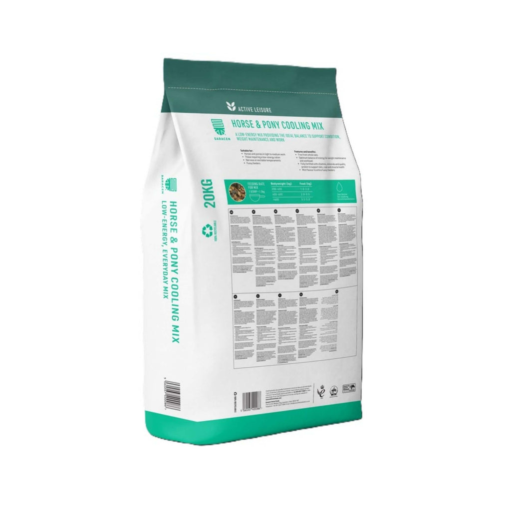 Saracen Horse & Pony Cooling Mix is a low energy mix ideal for horses and ponies in light to medium work. Based on highly digestible "Super-Fibres" and micronized cereals it provides the optimum balance of energy for weight maintenance and work. The mix provides a balanced diet and is fully fortified with a full spectrum of vitamins, minerals and quality proteins to help maintain overall health and vitality whilst supporting muscle tone and topline. In addition, the mix contains a blend of natural herbs which are known for thie respiratory, digestive and anti-inflammatory properties.Â