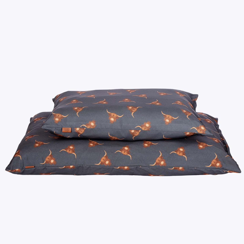 The Danish Design Bramblehorn Deep Duvet brings rugged Highland charm and exceptional comfort to your dog’s everyday rest. Featuring a bold, shaggy Highland cow print in warm browns, soft tans and a rich steel-blue grey background, this cosy duvet blends rustic style with modern home aesthetics.