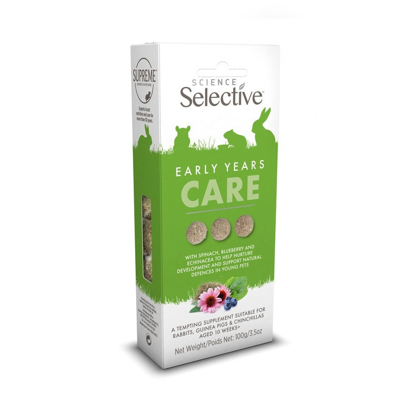Supreme Selective Early Years Care Supplements. Science Selective Early Years Care supplements are formulated to help nurture growth and natural defences with spinach, blueberry, and echinacea to help nurture development & support natural defences in young pets.