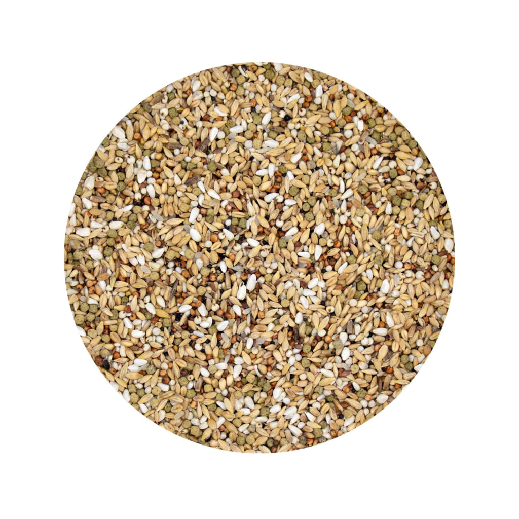 Composition: White pigeon wheat 20%, Sudanese White Dari 10%, Red Dari 10%, Safflower seed 8%, White Pigeon Barley 23%, Paddy Rice 10%, Broken Rice 2%, Peeled Oats 4%, Brown Linseed 2%, Black Coleseed 2%, German Thistle Seed 1% & Diet Pellet I.C.+ 8%