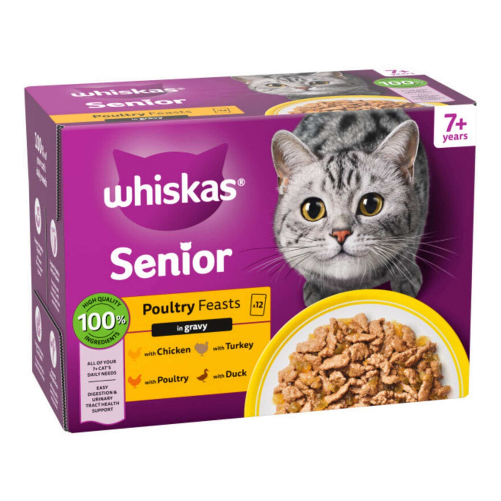 Whiskas Senior 7+ Poultry Feasts in Gravy. Cat lovers know that purring is the best sound you can hear. This delicious wet cat food recipe makes millions of cats around the world rush to their bowls with purring excitement and lickingly-good satisfaction. Prepared with love and care cat food pouches are nutritionally balanced to ensure your cat has everything they need to keep them purring. Whiskas 7+ Poultry Feasts adult cat food pouches in gravy are specially prepared to preserve the natural goodness and deliciousness of high quality ingredients and will see your cat rush to the bowl faster than ever before! Made with sustainably sourced ingredients these cat food pouches contain everything your cat needs to keep them happy and healthy.