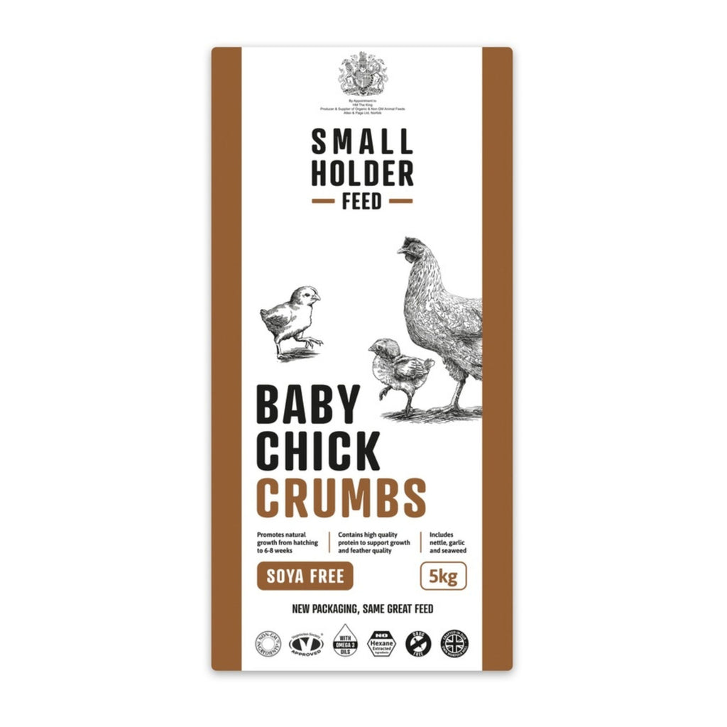 Allen & Page Small Holder Range Baby Chick Crumbs are a complete feed for baby chicks, to be fed from hatching through to 6-8 weeks. Allen & Page Baby Chick Crumbs contain a special blend of mixed herbs, essential oils and natural plant extracts to support health and development. These chick crumbs are soya free, and made from the highest quality non-GM ingredients.